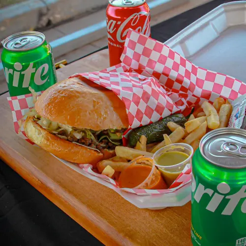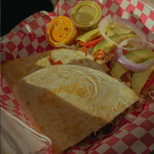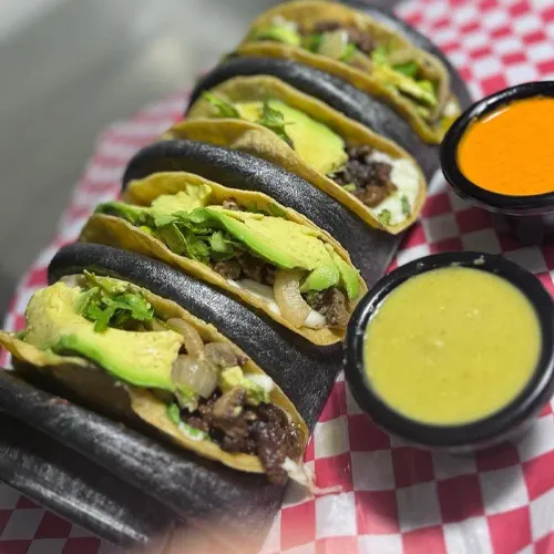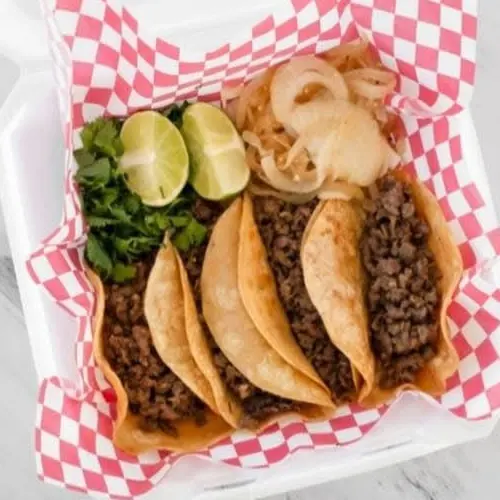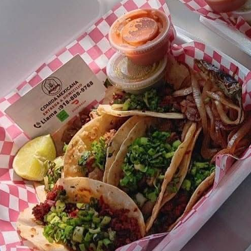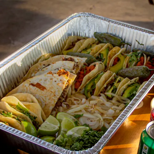 16 tacos, two special backed potatoes, grilled onions, cilantro, toreados pepper and 4 sodas.