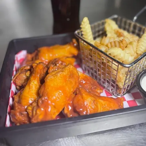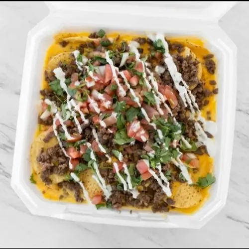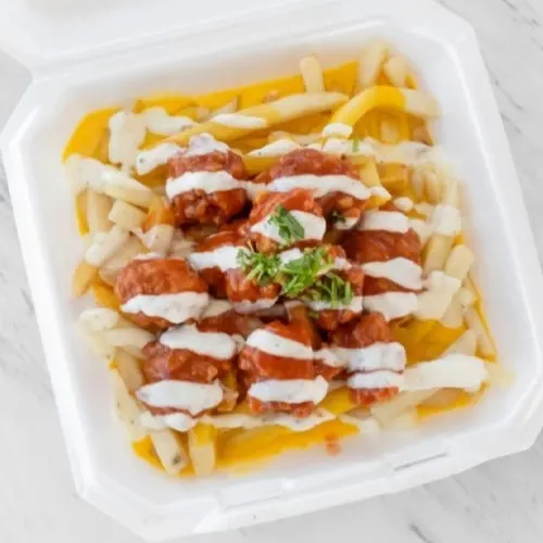 Bad of french fries with yellow cheese, covered with your choice of boneless and salsa, ranch and cilantro.
